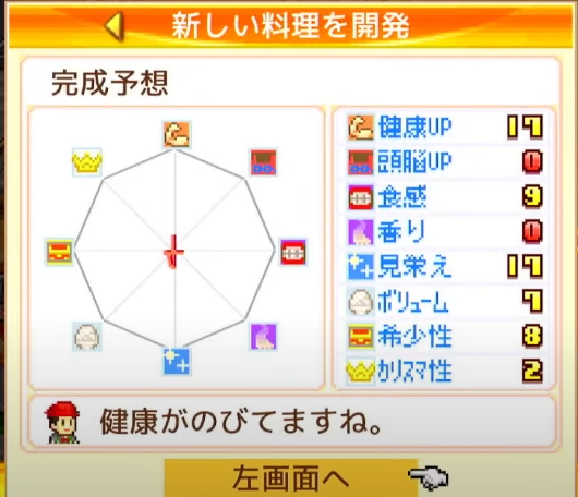 そしてこれがメニューのステータス画面。黄色の文字が上昇するステータス。赤の文字が下降するステータスという事ですね。このグラフを見ながら、自分の任意のステータスを上げてより良い料理にしていこう!という感じです。