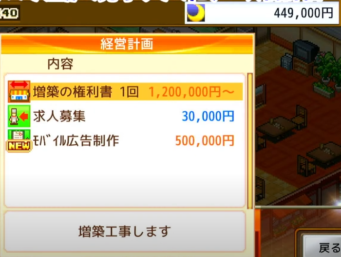 高いのは高いけど増築よりは安い。でも新規店舗は設備投資が必要なので見た目よりはお金がかかる。まぁどちらにせよお金が足りないという事には変わりがないので、まずはお金を増やす事にします。