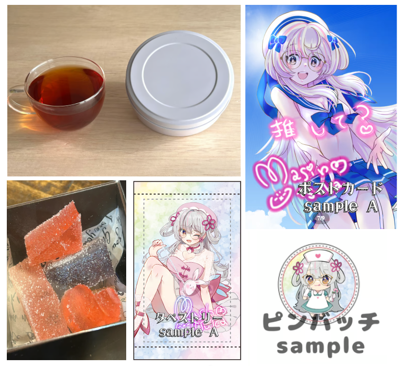 先ほどの和紅茶のセットに、ポストカードとピンバッジが付きます。こちらのピンバッジは枠が金色らしいです。