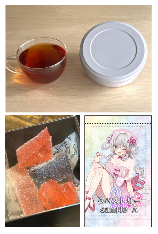 このような内容になっています。和紅茶(ティーパック)と琥珀糖、そしてタペストリーです。